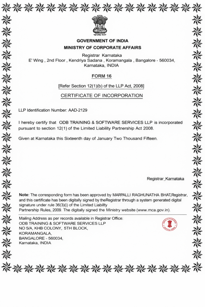 The Registrar of Companies examines the submitted application and documents to ensure compliance with the Limited Liability Partnership Act, 2008. Any discrepancies may lead to queries or resubmission. - Issue of Certificate of Incorporation